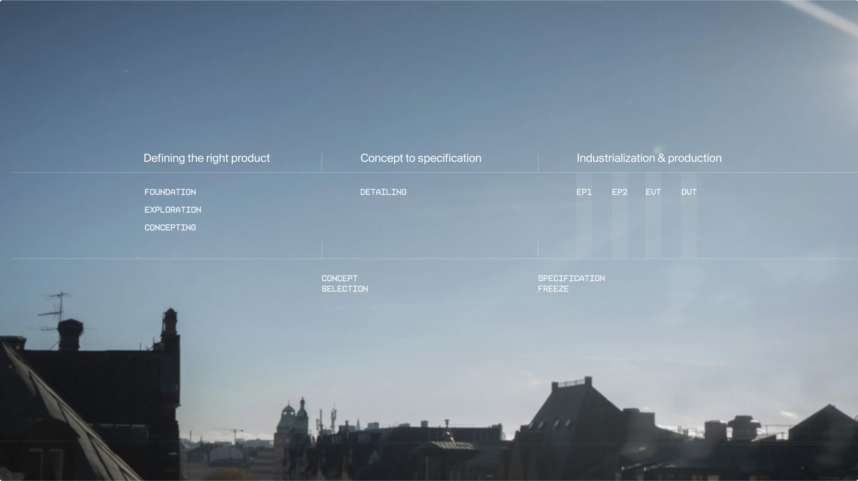 Pre-studies De-risk and make informed decisions: Product requirement specification drafting Manufacturing & cost estimations Product feasibility analysis Sustainability evaluation Development timeline mapping